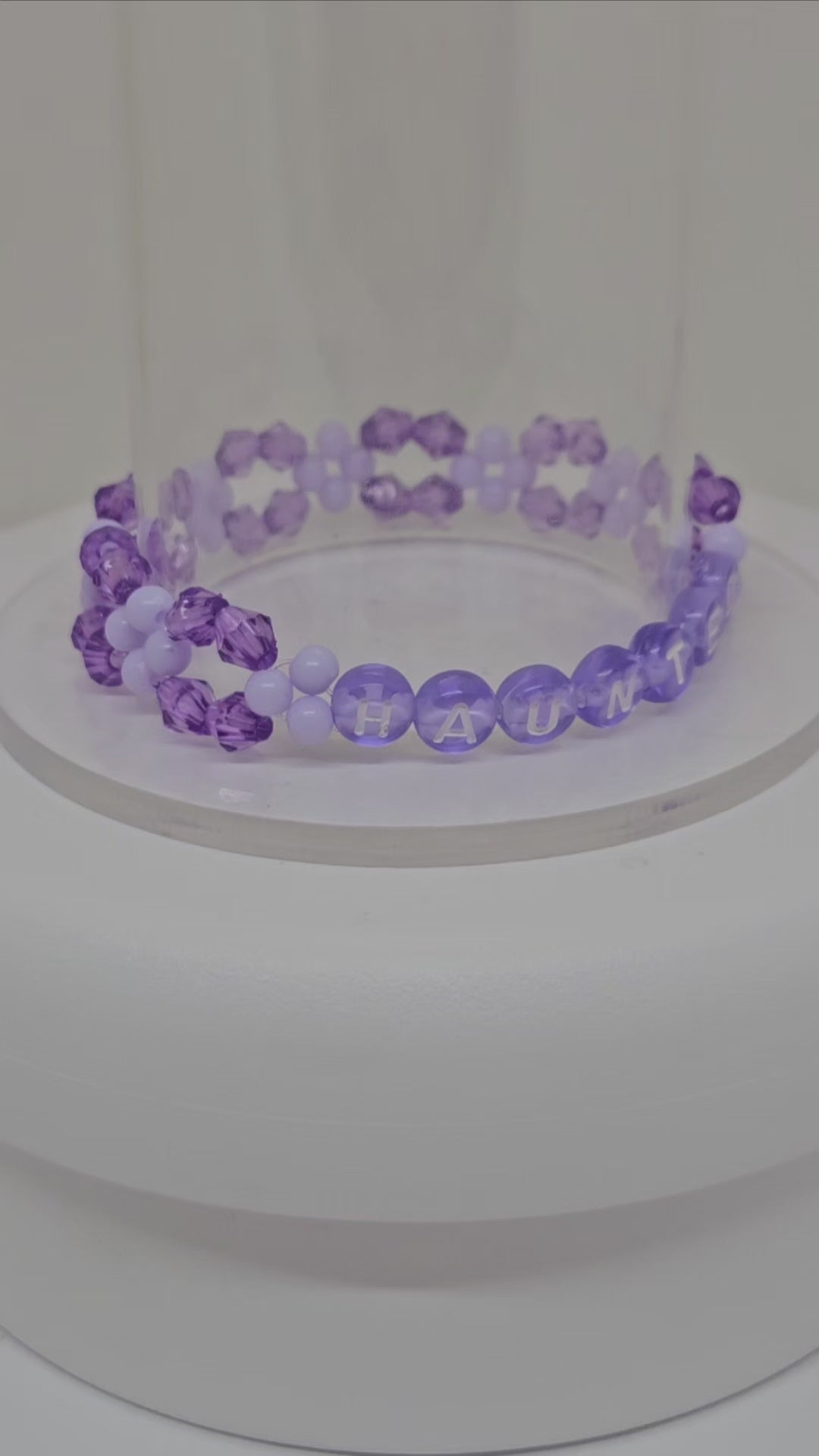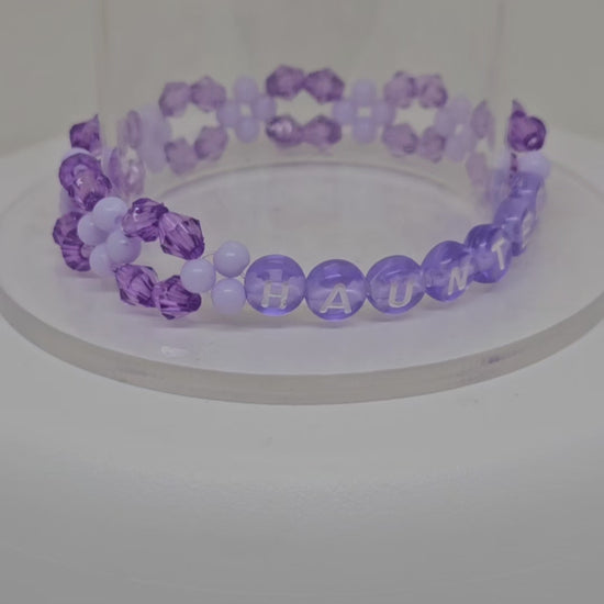Bracelet features purple and lilac beads with "Haunted" in purple beads with white writing.
